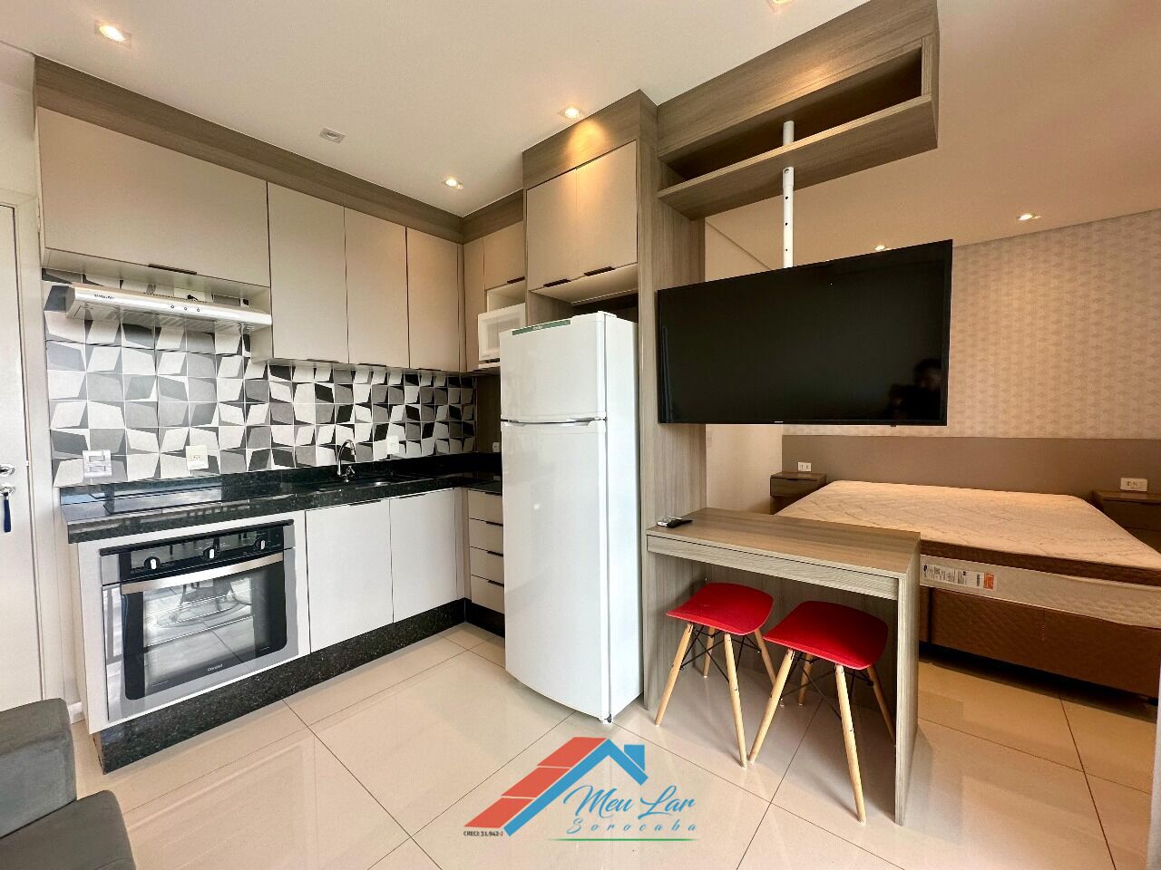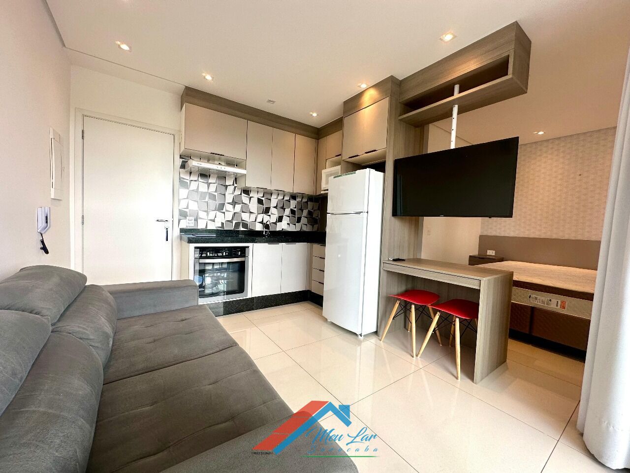 - Mobiliário Completo: Sofá, banquetas, mesa interna e na varanda, cadeira/bancada para home office, cama box Queen com molas ensacadas.